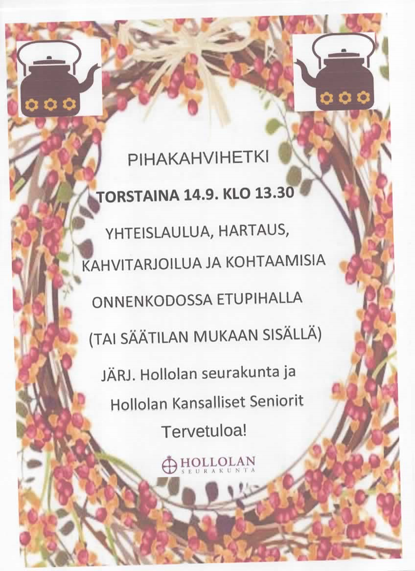 Hollolan kansalliset seniorit ja seurakunta ovat järjestämässä Onnenkodon asukkaille päiväkahvihetkeä to 14.9. klo 13.30 - 14.30.